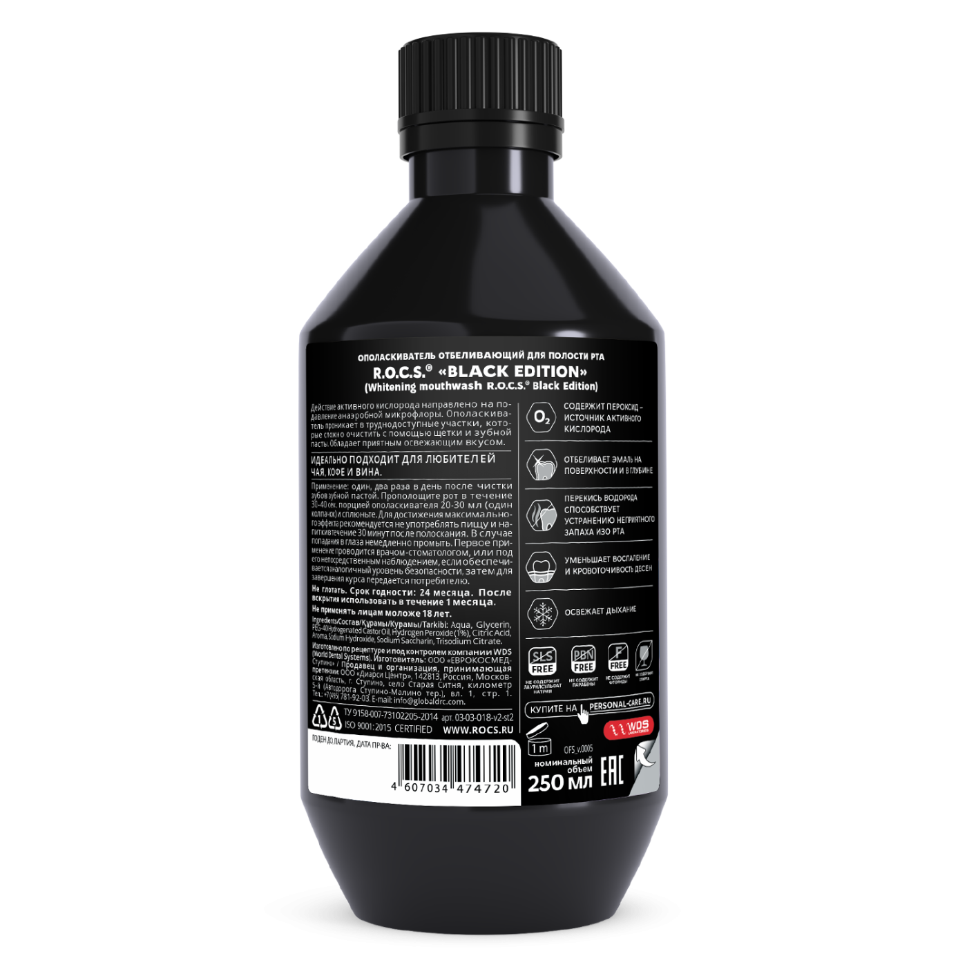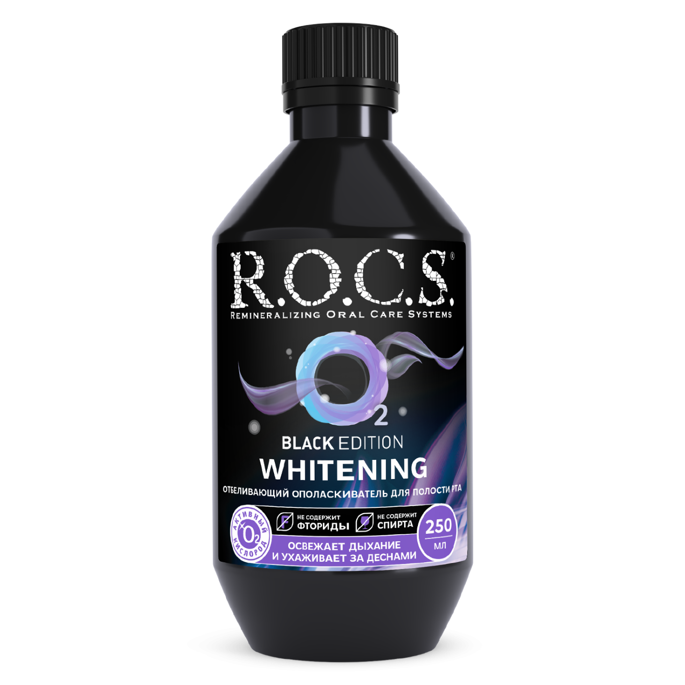 Отбеливающий ополаскиватель R.O.C.S. (РОКС) Black Edition в новом объеме - 250 мл. Благодаря свойствам активного кислорода отбеливает эмаль на поверхности и в глубине.